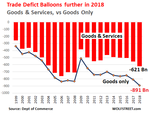 - US trade deficit in goods and services jumped 12.4%, or by $69 billion, to $621.0 billion, after it had already jumped by 10% in 2017. The worst trade deficit in goods and services since 2008.