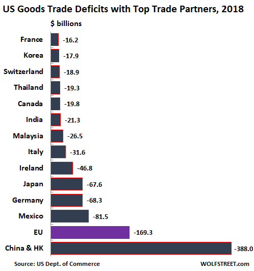 The opaque nature of trade dealings – transshipments, trade invoicing, tax issues, etc. – along with issues of ports of entry, etc., can produce peculiar results. For instance, the US had a trade surplus of $25 billion with the Netherlands and of $14 billion with Belgium, and not because the end-users of US products are in the Netherlands and Belgium. And the US had a huge trade deficit of $47 billion with tiny Ireland (up from $38 billion in 2017) where many US companies shelter part of their profits from US taxes.