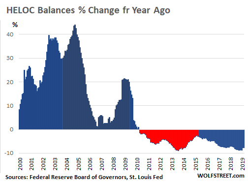 The housing-and-mortgage crisis annihilated those dreams of the endless ATM. And it seems, Americans learned a lesson – a lesson that neither lenders nor the Fed appreciate. The lenders make money off HELOCs, and so they push them. And the Fed wants consumers to borrow against their homes and spend this money, according to William Dudley, when he, at the time still president of the New York Fed, was lamenting this “evolving consumer behavior.”