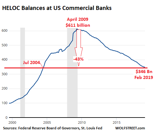 At the end of February, outstanding HELOC balances at all commercial banks in the US fell to $346 billion, according to the Federal Reserve Board of Governors. They’re down 43% from the peak in April 2009 – and now back where they’d been in July 2004 on the way up. This marks a decline that has now lasted 10 years: