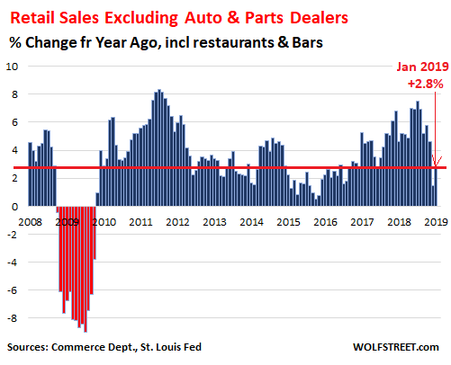 Retail sales, including at restaurants and bars, but excluding the drag of auto and parts dealers, rose 2.8% in January year-over-year after ticking up 1.5% in December. This was down from growth rates peaking at 7.5% in July last year (chart on same scale as above). That 2.8% year-over-year growth rate was right in the middle of the range since 2010: