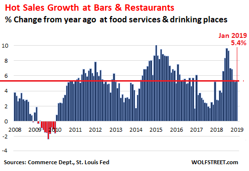 January retail sales confirm the trend seen late last year: Overall retail sales, including at restaurants and bars (“food services and drinking places”), had been running at red-hot growth rates starting in 2017, reaching 6.6% year-over-year last summer; and they’re still growing year-over-year but at a slower rate, with sales at auto dealers and parts stores acting as a drag, and with sales at restaurants and bars acting as a push.