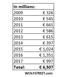 The “income from fictitious and/or irregular transactions” found during investigation of the years 2009-2017 amounts to €6.5 billion ($7.4 billion), by year: