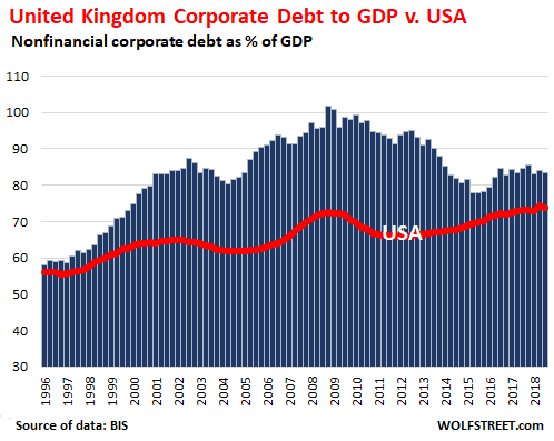 The UK debt-to-GDP ratio has been high for years, and is in part related to the City of London as a tax haven for global corporations. But 83.3%, it’s down from 101% at the beginning of the Global Financial Crisis: