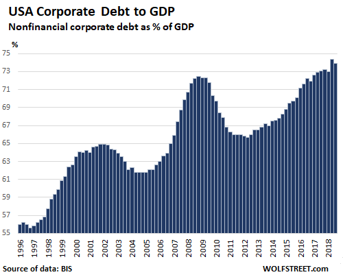 A narrower measure is nonfinancial corporate debt, which amounts to $15 trillion. This is up a breath-taking 40% from the prior peak in 2008. The Bank for International Settlements (BIS) uses this measure to compare how corporate debt stacks up in different countries. One of its measures is corporate debt denominated in local currency; and in order to determine the relative size of this debt, the BIS expresses it as a percent of nominal local-currency GDP. So Chinese debt in yuan as a percent of Chinese GDP in yuan. By this measure, the US nonfinancial corporate debt-to-GDP ratio has ballooned to the highest ever: a stunning whopping 73.9% of GDP: