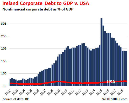 The hottest thing for US corporations was to engineer a move to Ireland on paper, to dodge US taxes. One of these maneuvers is a corporate tax inversion. For example, Allergan, a pharmaceutical giant that generates most of its sales in the US, was formed in 2015 when Irish–registered Actavis acquired the much larger US company and assumed Allergan’s name. Note the fabulous spike in Ireland’s corporate debt-to-GDP ratio at that time.  Actavis, formerly a US company as well, had performed the same feat in 2013. These companies didn’t actually move to Ireland, but now at least some of their corporate debt shows up in Irish data — instead of in the US data: