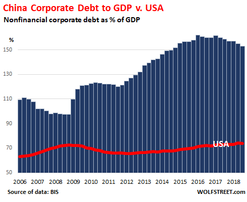 The tax-haven syndrome mucks up the numbers. Ahead of China in terms of the corporate debt-to-GDP ratio are a gaggle of small countries that are in effect tax havens for global corporations, including US companies whose debts start showing up in Ireland and elsewhere because that’s where they’re suddenly headquartered. Number one is tiny Luxembourg. There are five of those countries ahead of China, plus Sweden, which leaves China in 7th place.