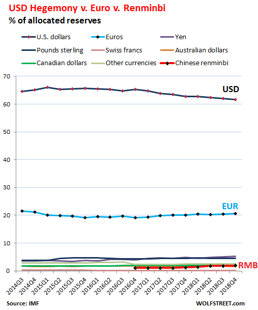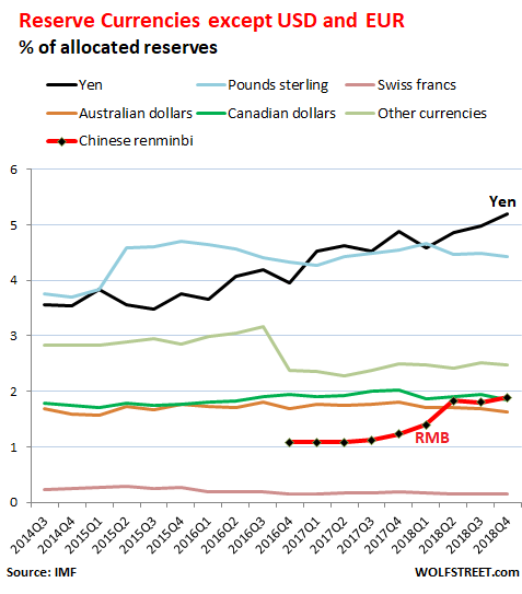 The combined share of the dollar and the euro edged down to 82.4% in Q4 2018. The remaining currencies make up 17.6% of allocated global reserve currencies. On October 1, 2016, the IMF added the Chinese renminbi to its currency basket, the Special Drawing Rights (SDR), elevating it to an official global reserve currency. Hopes by some folks that it would dethrone the dollar as hegemon have been disappointed. But little by little, the renminbi is gaining. In Q4 2018, with a share of 1.89%, it beat the Canadian dollar for the first time and moved up to fifth place on the list: