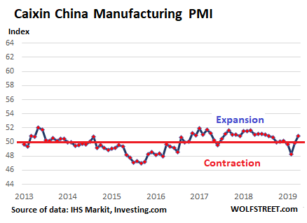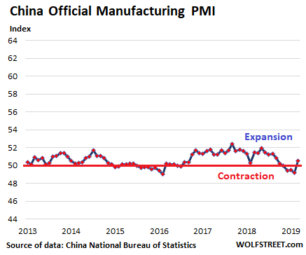 And the report commented about what really mattered (emphasis added): “Overall, with a more relaxed financing environment, government efforts to bail out the private sector and positive progress in Sino-U.S. trade talks, the situation across the manufacturing sector recovered in March.”