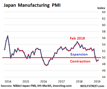 “Japan’s manufacturing economy ended the first quarter in poor shape, with weaker demand pulling production volumes deeper into contraction,” a the economic backdrop for manufacturers “remains fiercely challenging,” according to the Nikkei Japan PMI. At 49.2 in March – slightly up from February, which had been the lowest in 32 months, the index remains in contraction mode, “thus signaling a further slowdown.” It “rounded off the worst quarterly performance in Japan’s manufacturing sector since Q2 2016” (I put this chart on the same index scale as Germany’s, from 44 to 64):