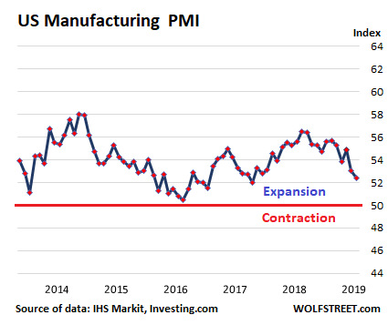 So in this snapshot of the four biggest manufacturing powerhouses in the world, German manufacturers are as gloomy as during the euro debt crisis and very nervous; Japanese manufacturers are worried by the ongoing slowdown; Chinese manufacturers are counting on the government to provide “a more relaxed financing environment” and “bail out the private sector”; and US manufacturers are in weakening growth mode – the slowest growth since 2016 – and for now, the cleanest dirty shirt that’s getting dirtier.