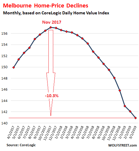 In the Melbourne metro, the second largest market in Australia, the CoreLogic Home Value Index fell 0.8% in March from February, and 9.8% year-over-year. Prices in the most expensive quarter of the homes the sold dropped 13.9% from March last year.