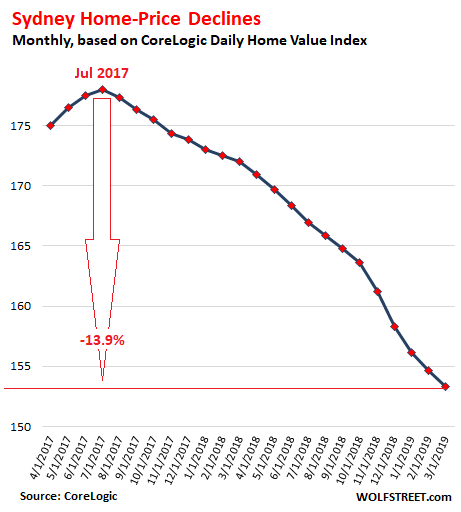 Home prices in the metro area of Sydney, according to CoreLogic’s Home Value Index, fell 0.9% in March from February and 10.9% from March last year. Prices in the most expensive quarter of the housing market dropped 11.9% year-over-year. Since its peak in July 2017, the index has dropped 13.9%: