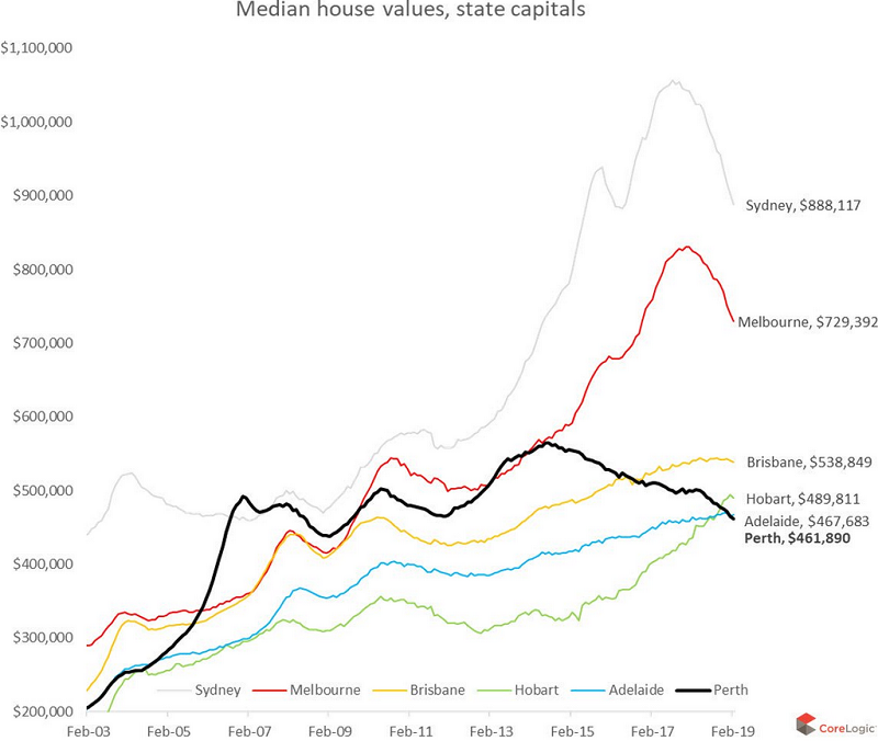 The chart below from CoreLogic (data as of March 1, 2018) shows the long-term movements of the median house values in the six largest state capitals. The downturns in Sydney (top gray line) and Melbourne (red line) stand out. The thick black line whose downtrend started in 2014 is for Perth. Darwin is not on the chart. Note how prices in Hobart (green) have surged in recent years. Amounts in Australian dollars (click to enlarge):