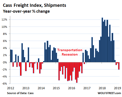Shipments by all modes of transportation – truck, rail, air, and barge – have been trending down for month after blistering record levels last May, and have now dropped on a year-over-year basis for the third month in row, according to the Cass Freight Index. In February, the last data available, they dropped 2.1% from February last year: