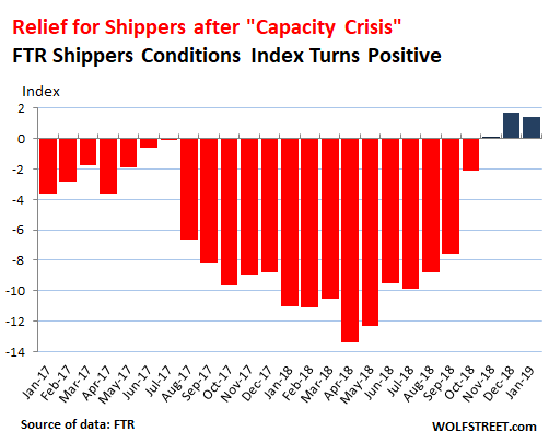 The dropping line haul rates and rising trucking capacity – after the spike in rates and the capacity panic last year – provides some relief for shippers, such as industrial companies or retailers that had been complaining in their earnings reports about freight rates and shipping bottlenecks.