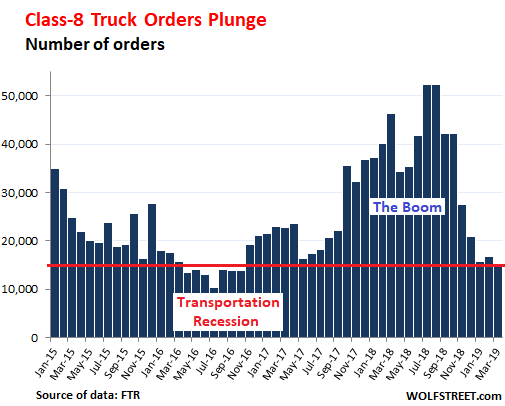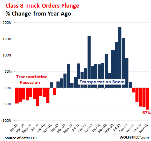 This is one of the most cyclical industries, with legendary boom-and-bust cycles: Orders for Class-8 trucks plunged 67% in March compared to March last year, to 15,200 orders, the lowest March for orders since 2010, according to FTR Transportation Intelligence. These are the heavy trucks that haul consumer goods, equipment, commodities, and supplies across the US. This plunge comes after orders had already plunged 58% year-over-year in February and January and 43% in December.
