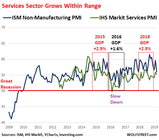 The services sector, accounting for about 70% of the US economy, has been backing off from the red-hot spurts experienced for brief periods in 2018 that had been similar to the red-hot growth spurts in 2015. In both 2015 and 2018, “real” GDP (adjusted for inflation) grew 2.9%, the fastest growth since the Great Recession. And the latest data shows that the economy is now reverting from the top of the range to the middle of the range.