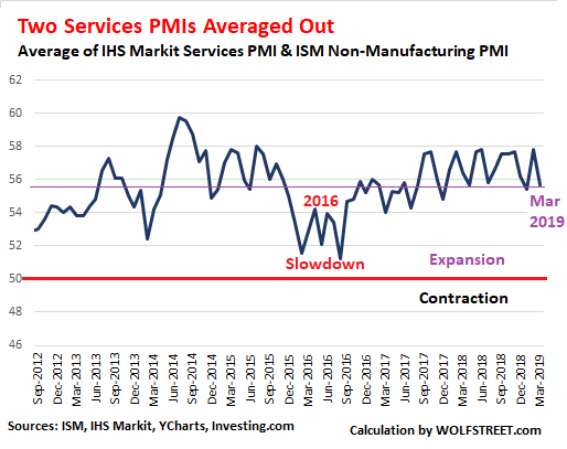So I did something that I should have known better not to do, but I was home alone, so to speak: I averaged out both indices (adding the data points of both indices for each month going back to 2012 and dividing the results by two). This removes some of the noise and shows the trend more clearly, including the slowdown in growth of the services sectors in 2016, and the reversion toward the middle of the range of growth that set in after the 2016 slowdown: