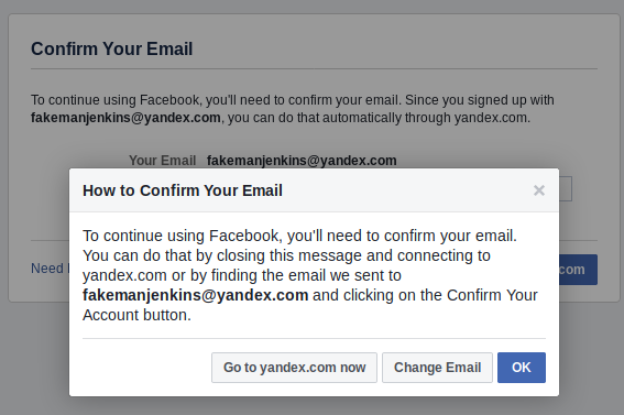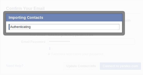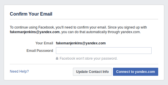 Last weekend, news broke that Facebook has been demanding some new users enter their email passwords in order to sign up for an account on the site. First publicized by cybersecurity specialist e-sushi on Twitter, the unnervingly phishing-like process worked like this: any user who tried to create a new account on Facebook with an email from one of a few providers (including Yandex and GMX) was directed to a page that asked them to “Confirm [Their] Email”–by entering their email password.