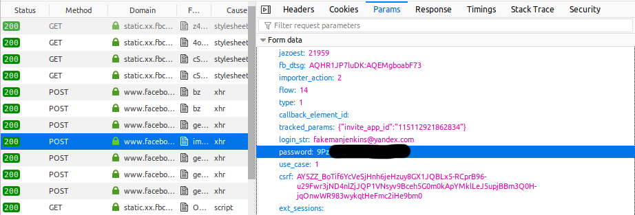 First, we observed that when we clicked on the “Connect to yandex.com” button, our email and password were sent directly to Facebook. Do not pass go, do not “Connect” to the third-party service the password belongs to. Facebook might not have stored our password, but it certainly saw it.