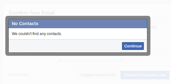 This tool worked the first time we tried it, on April 2, but by April 3, after the story had broken, every email we entered (including the Yandex one) prompted a “can’t import contacts from this address yet” message. For now, it appears that Facebook may have shut down the “Find Friends” program as well.