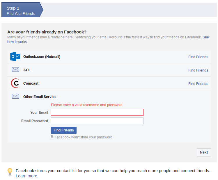 This tool is more transparent about its intentions, but it still qualifies as a security mess. Here, Facebook encourages users to enter their email and (email) password in order to “find friends” who are already on Facebook.