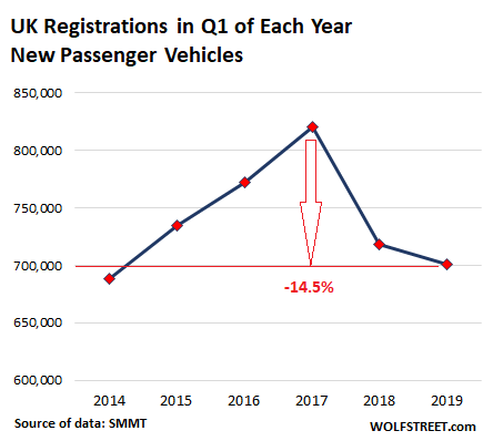 The real problem is the collapse in sales of diesel vehicles in the UK, mirroring a trend that is wreaking havoc across Europe’s auto markets. In the first three months of 2019 year-on-year sales plunged 20.3%. During the three years since Q1 2016, diesel sales have collapsed by 47%, to just 191,785 units in Q1 2019: