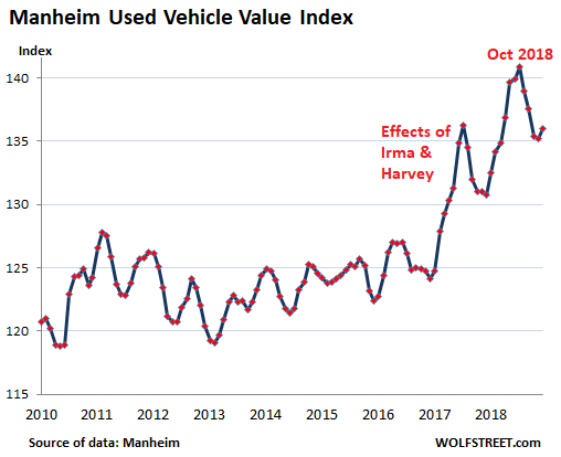 At wholesale auctions, used-vehicle prices rose 4.0% in March from March last year, according to Manheim, the largest auto-auction company in North America, which runs about 8 million vehicles through its auctions a year. In the chart of the Manheim Used Vehicle Value Index, which is adjusted for mix, mileage, and seasonality, note the spike through October 2018, alongside the spurt of the economy in Q2 and Q3, and the subsequent decline that left prices at still very high levels:
