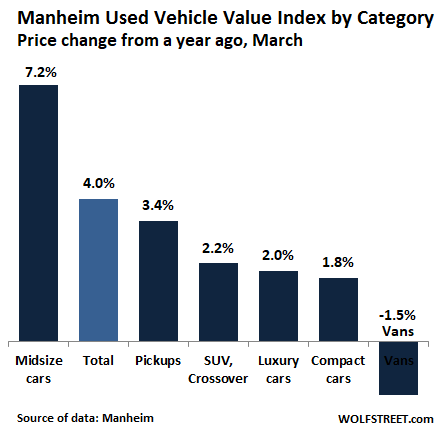 At these wholesale auctions, used mid-size cars – total duds as new vehicles – saw such brisk demand in March that prices jumped 7.2% from March a year earlier. Except for vans, all major vehicle classes experienced wholesale price increases compared to March 2018, according to Manheim, but the surge in the prices of midsize cars stands out: