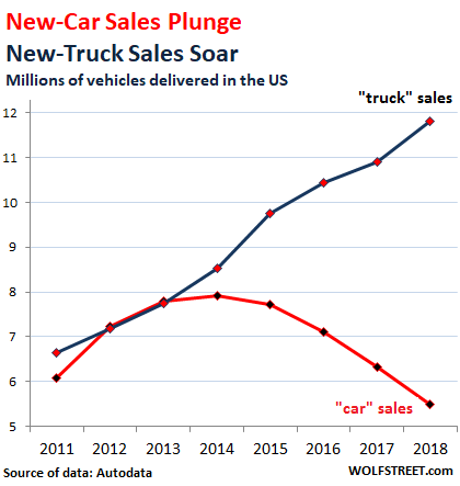 The rift in terms of cars between what is happening in the new-vehicle market and in the used-vehicle market is getting wider: On the new side, car sales have been getting crushed since 2014, while sales of “trucks” – pickups, SUVs, crossovers and vans – have become red-hot. Over the four years of Carmageddon, as I call it, from 2014 through 2018, industry-wide new-car sales have plunged nearly 30% to just 5.5 million units while new “truck” sales have soared 38% to 11.8 million units. This is the chart I like to show: