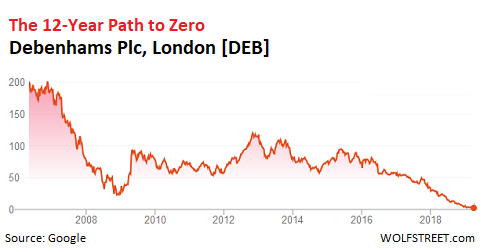 Shares of UK-based multinational department store Debenhams — with 165 stores in the UK and Ireland and with 58 franchise stores in 19 other countries — were suspended today after the company and its creditors turned down two last ditch rescue offers from discount retail group Sports Direct, which owns close to 30% of Debenhams’ stock. Debenham’s shares have collapsed spectacularly since they were floated on the stock market in 2006 by its then-private equity owners, Texas Pacific Group, CVC, and Merrill Lynch Private Equity: