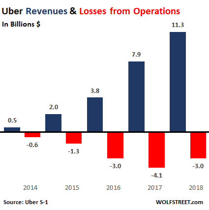 Uber’s rideshare revenues skyrocketed from $495 million in 2014 to $11.3 billion in 2018. But losses from operations have also skyrocketed. In 2017, these losses from operations hit $4 billion, over half the company’s revenues. In 2018, losses from operations were $3 billion. Over the past three years, these losses from operations added up to $10.1 billion: