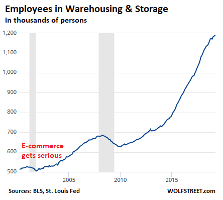 Here is the data from the nonfarm payrolls report about warehousing and storage employees. Over the 18 years since 2001, they surged by 140%, from 500,000 to 1.2 million persons. These are all very “local” jobs: