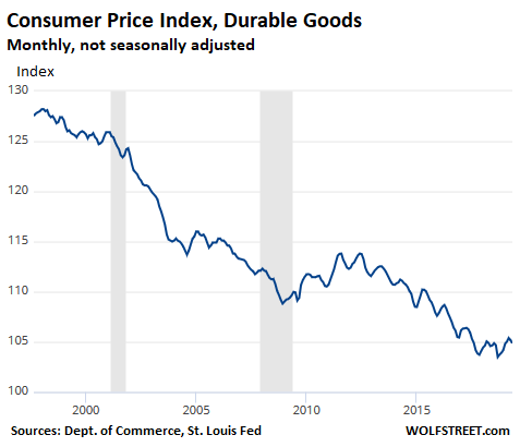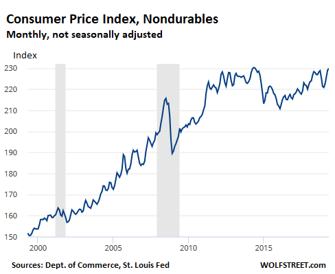 Food and energy prices are volatile, driven by the highly volatile prices of oil and the equally volatile prices of agricultural commodities, dairy products, and meat. That is why “core inflation” strips out food and energy prices. But food and energy are large components of the CPI for non-durable goods.