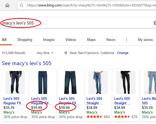 Then I switched browsers and used Bing to search for Levi’s 505, and I had to play Amazon against Macy’s to get the price down, and after a few searches, I got this: