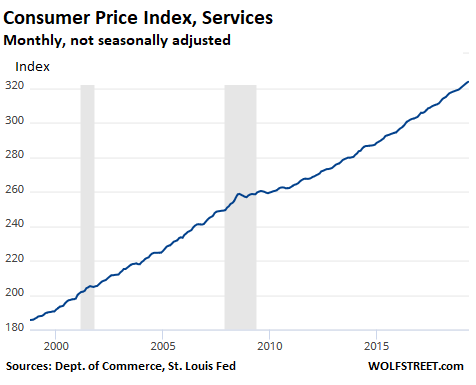 The chart shows 20 years of the services CPI as index, rather than percent change. It went from 188 to 324. In other words, what $188 bought in 1999 would now cost $324. So with respect to services, the dollar has lost 42% of its purchasing power over the past 20 years: