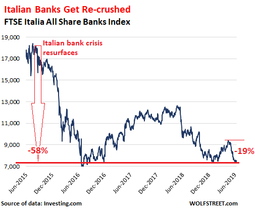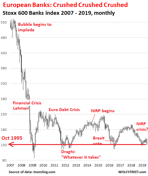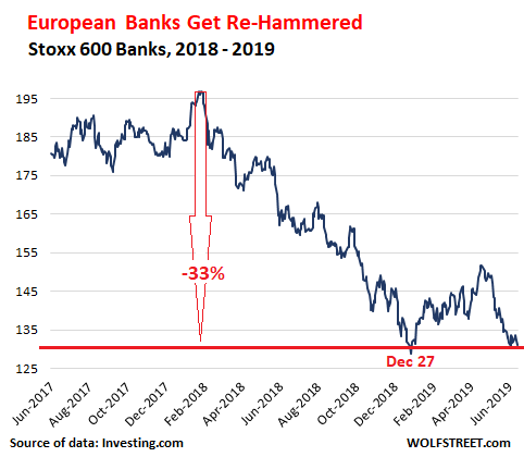 European bank shares – which have been getting crushed and re-crushed for 12 years – are getting re-crushed again. On Friday, the Stoxx 600 Banks index, which covers major European banks, including our hero Deutsche Bank, dropped to an intraday low of 130.5 and closed at 131.2, thereby revisiting the dismal depth of December 24, 2018 (130.8).