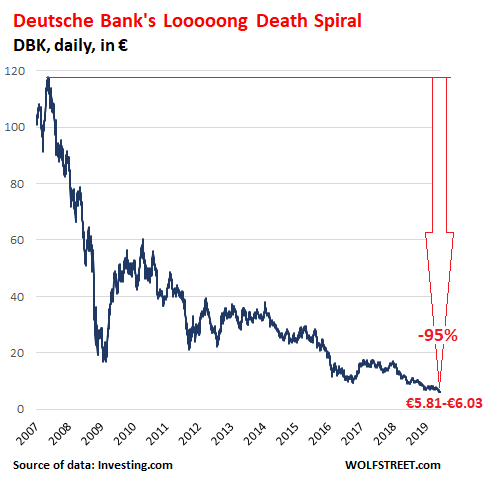 Our hero among European banks, in particular because of its size, is Deutsche Bank. It fell to a new historic low of €5.81 on June 3, and on Friday closed at €6.03. Its shares have now plunged 95% from the peak in 2007: