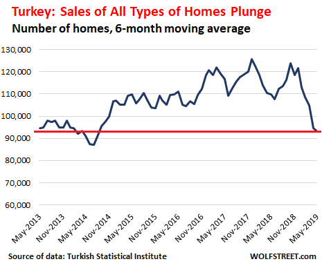 Sales of homes of all types in Turkey plunged 31% year-on-year in May to just 82,252 units, after having already plunged 18% year-over-year in April, according to the Turkish Statistical Institute. It was the sharpest year-over-year drop in the data going back to 2013, as Turkey’s economic crisis continues to bite. For the first five months of 2019, home sales dropped 19% compared to the same period last year, to 423,088 units.