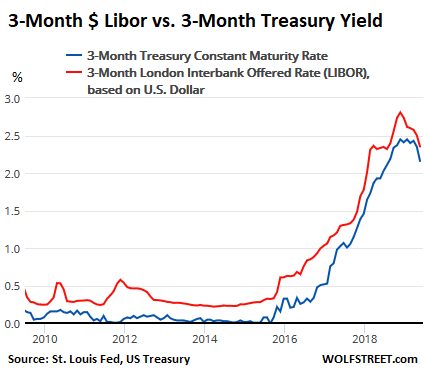 Short-term Treasury yields have plunged, pricing in with near-certainty a rate cut in July, and more later in the year. The three-month dollar LIBOR has dropped in parallel to 2.4% from 2.8% at the end of last year.