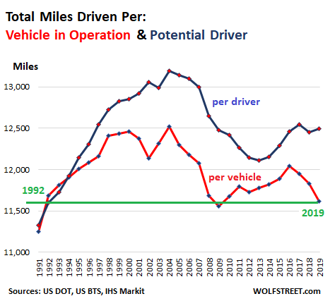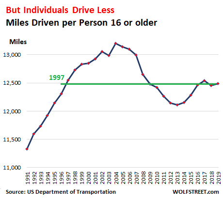 And there has only been a tepid recovery since then, which started fading again over the last two years: During the 12-month period through April, the average potential driver drove 12,500 miles — less than 22 years ago in 1997: