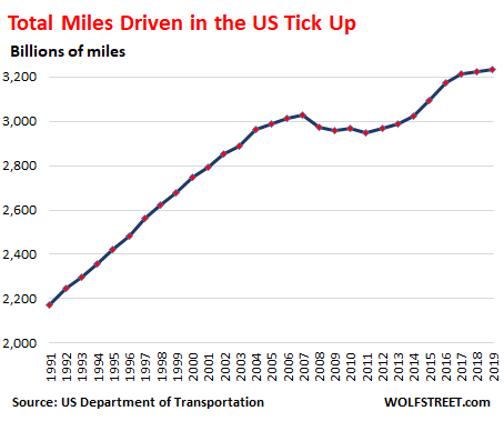 On the surface, we see this: Total miles driven in April on all roads and streets in the US rose by 2.5%, or by 6.8 billion miles, compared to a year earlier, to 279.3 billion miles, according to estimates by the US Department of Transportation this week. Of this total, 82.5 billion miles were driven on rural roads, including interstate highways, and 196.8 billion miles were driven on urban roads and streets.