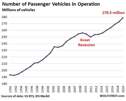 Second, vehicles in operation. New-vehicle sales are languishing at an estimated 16.9 million units in 2019 – where they’d first been in 1999 in a horribly mature market. These vehicles are the new additions to the national fleet. Over the same period, about 11 million vehicles were removed from the fleet, either by being sent to the salvage yard or by being exported to other countries. And the total number of vehicles on the road has risen by the difference, 5.9 million units over the past 12 months, to a record 278.3 million vehicles: