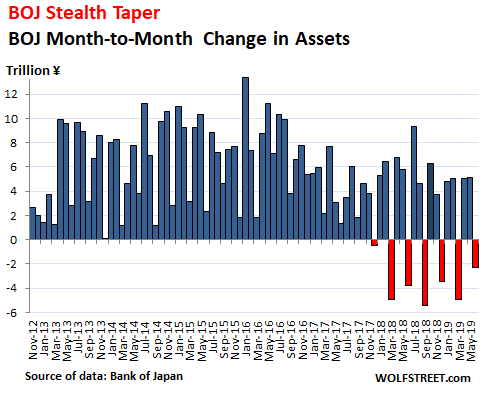Despite the Bank of Japan’s repeated statements over the years that it would pursue its QE program – or “QQE” as it calls it to distinguish it from the Fed’s flimsy version – with full and relentless force by adding ¥85 trillion ($790 billion) a year to its balance sheet, it hasn’t done that since the beginning of 2017. Instead, it has sharply reduced its QE purchases.