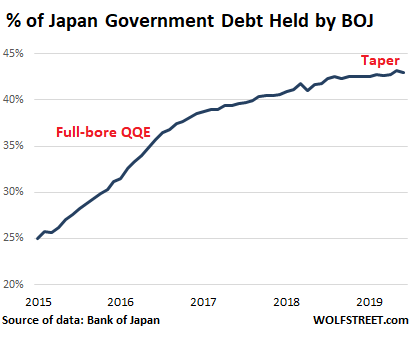 This whole game is of mind-boggling magnitude. But it’s not a game. The debt of the Japanese government has ballooned to ¥1.1 quadrillion, or about 200% of nominal GDP (in yen). And the BOJ now owns 43% of this debt, up from 25% in January 2015. But here too, you can see the impact of the taper, as the percentage has essentially been flat since August last year: