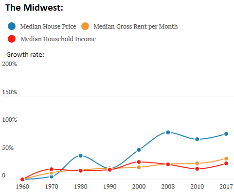 In the Midwest – Illinois, Indiana, Iowa, Kansas, Michigan, Minnesota, Missouri, Nebraska, North Dakota, Ohio, South Dakota, and Wisconsin – house prices increased a practically reasonable 82% since 1960 adjusted for inflation, while rents rose 37% and incomes 29%: