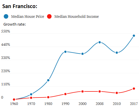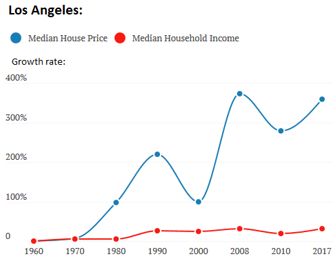 In Los Angeles, the median house price increased 358% since 1960, adjusted for inflation, while the median household income rose only 32%. In other words, house prices increased 11 times faster than household incomes: