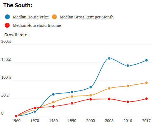 In the South – Alabama, Arkansas, Delaware, D.C., Florida, Georgia, Kentucky, Louisiana, Maryland, Mississippi, North Carolina, Oklahoma, South Carolina, Tennessee, Texas, Virginia, and West Virginia – house prices rose 156% since 1960, and rents 93%, while household incomes rose only 49%, all adjusted for inflation.