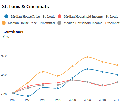 As sample cities for the Midwest, the Clever Real Estate study selected St. Louis and Cincinnati. In both cities, adjusted for inflation, house prices are still down from the peak of the prior housing bubble. And incomes, also adjusted for inflation, are about flat with the mid-1990s: